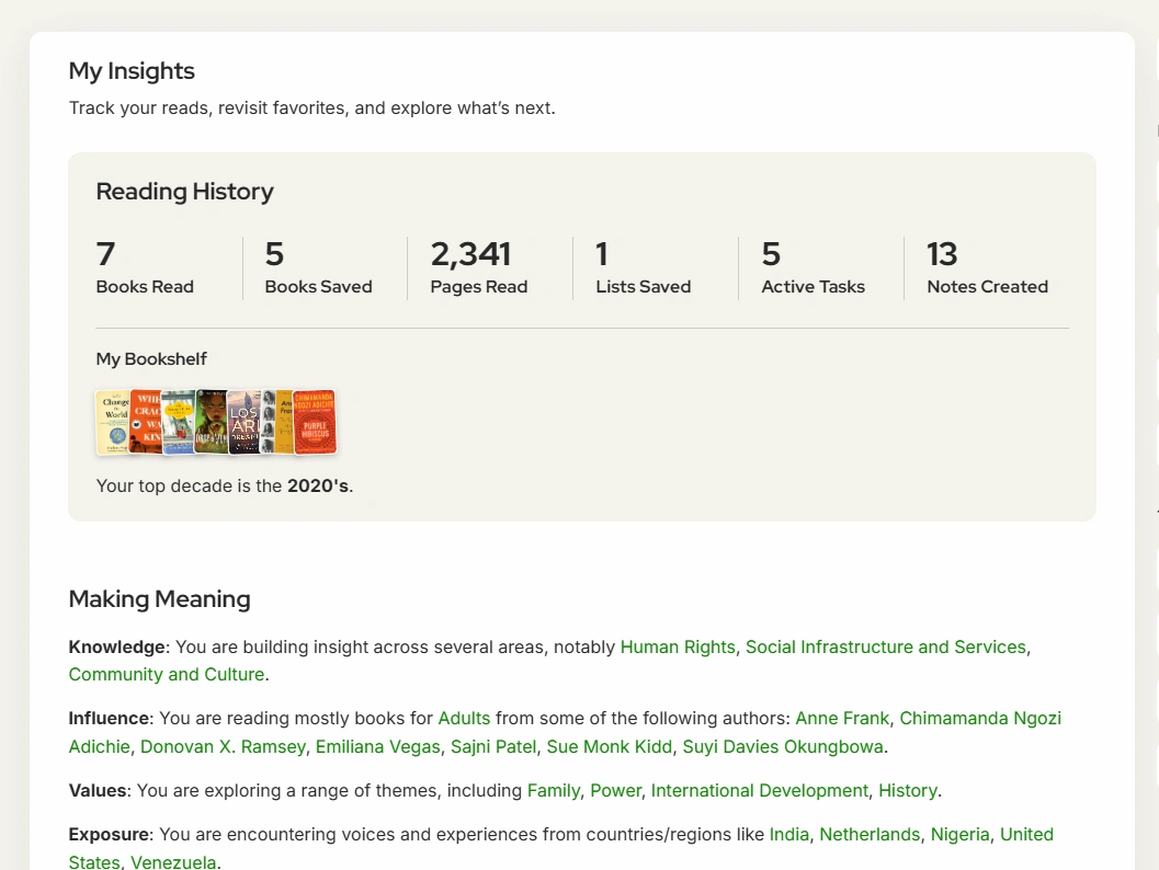 AI-supported data insights help you understand your unique reading identity, from the archetypes you express to the questions your books are asking of you.